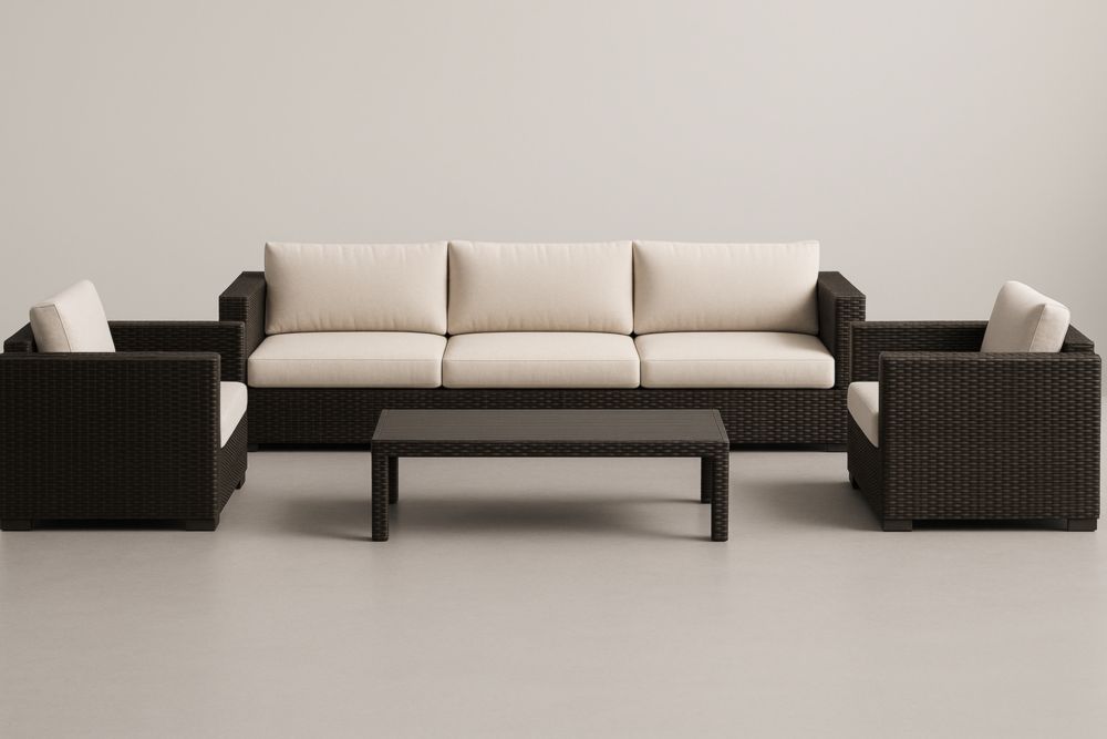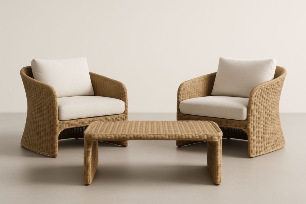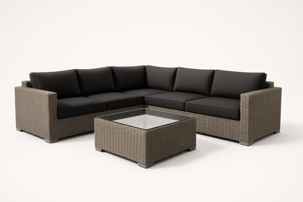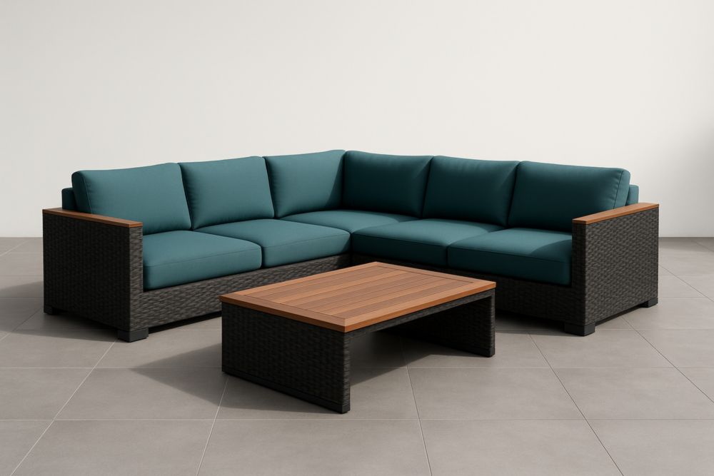 Divano angolare da esterno in rattan con cuscini verdi e dettagli in legno massello