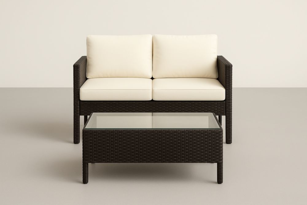 Set divano a 2 posti in rattan sintetico marrone con tavolino e cuscini crema