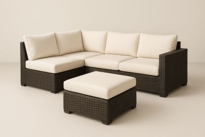 Set divano angolare da giardino in rattan con pouf e cuscini color crema