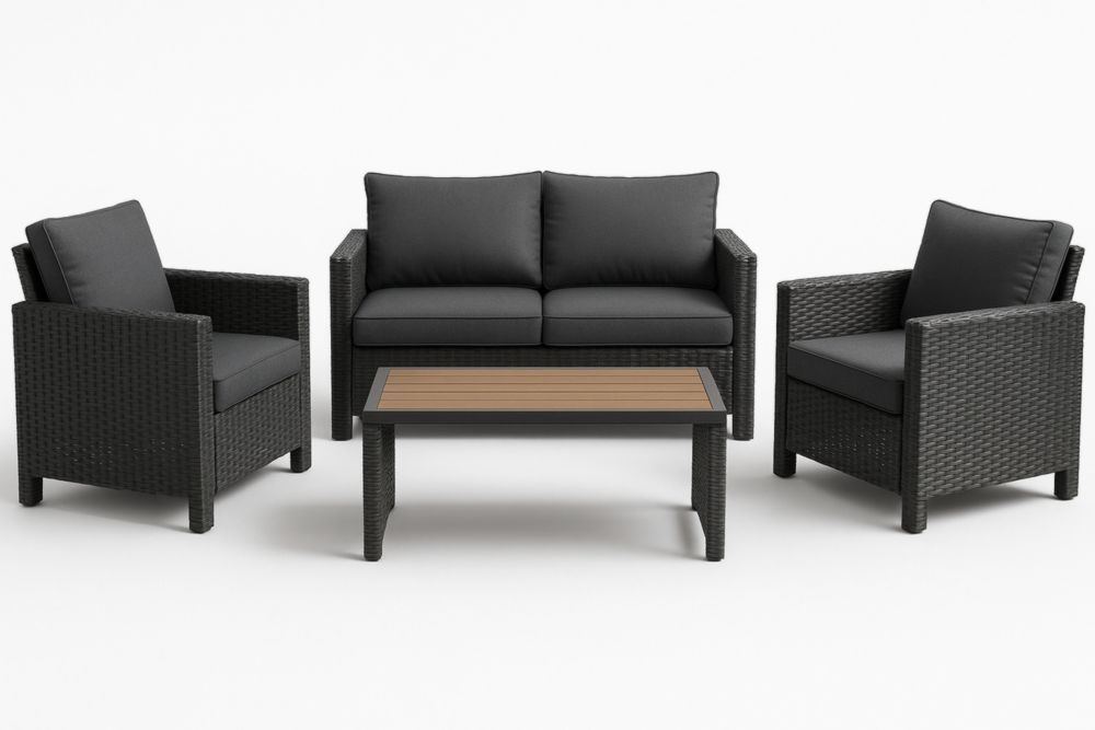 Set divano da giardino in rattan con tavolo e cuscini rimovibili neri